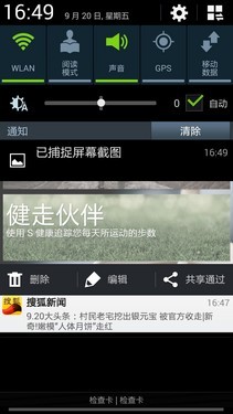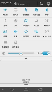 下拉菜单是每一部Android手机都不可或缺的,Mate2同样支持这一功能。为了在下拉菜单当中尽可能多的显示通知信息,快捷按键被设计成了可折叠的形式,用户可以通过点击快捷键下拉按钮来得到更多快捷按键,并且还支持屏幕亮度调节、快捷键自定义等功能。