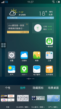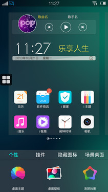 虽然界面上有所改变,但用户在操作上的便捷性并没有改变,主页面上通过菜单键可直接进入到桌面的编辑状态,你可以添加小插件、隐藏图标、设置场景桌面等操作。