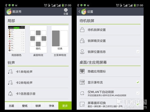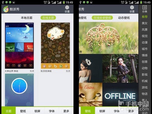 而对于有个性化需求的朋友,酷派秀则可以满足用户的大部分想法。里面提供了大量的在线资源,包括主题、壁纸、字体、锁屏样式等,还可以通过设置进行进一步的细节调整。