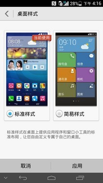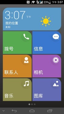 如果用户不喜欢如此花哨的页面排列,那桌面样式当中的简易样式一定会成为这些用户的首选。在简易样式模式下,各个功能会以卡片的形式(类似WP8系统)呈现在手机桌面上,相比合一桌面来说更加的简洁明快。