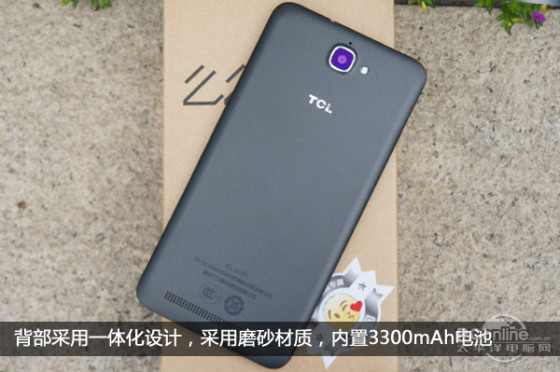 TCL么么哒整体不足8毫米的厚度让握持手感非常不错,正面给人以稳重之感。而背面采用一体化设计,所以后盖是不能打开。再者,由于材质是磨砂材质,不 容易滑手,但相对也比较容易粘上指纹。当然,为了符合消费者的个性选择,后壳除了黑色,还有白色、红色、黄色三种款式选择。另外,机身内置3300mAh 电池,容量还是颇为可观,能够提供足够续航。