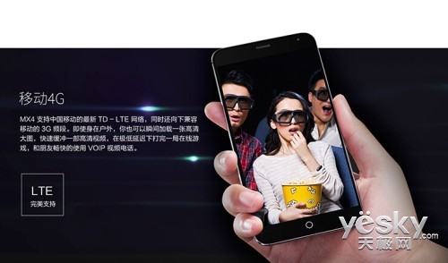 MX4支持5模13频,拥有移动联通4G版选择,最大下行速度达到 150 Mbps,相比MX3提升6倍。支持最新 802.11ac 协议,传输速度高达 433Mbps,同时支持 2.4 GHz 和 5 GHz 频段,如此,Wi-Fi 体验将更加酣畅淋漓。