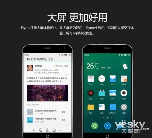 让大屏更为好用的 Flyme进化到 Flyme 4 。以自然为师,以万物为本,吸取四季的色彩,将其融合进侘寂风格中,这样的 Flyme 4 更多彩,更出彩。交互层面,重构了屏幕区域上下的功能模块,让屏幕上半部分为内容展示区域,下半部分为触摸区域。从功能层面,更多系统级整合,更完善的系统功能,加入安全中心、权限控制、阅读中心等,让用户在使用 Flyme 4 时,更加便捷省心。