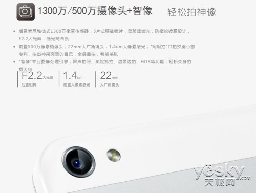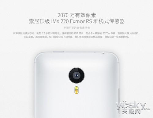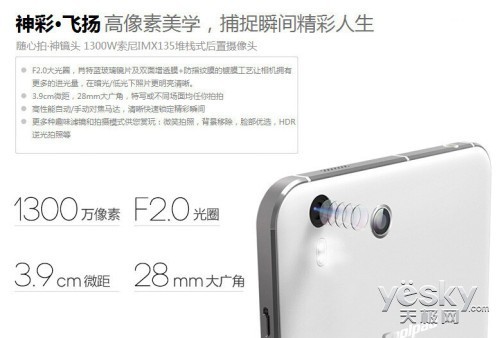 机身背部还设有一枚1300万像素索尼堆栈式摄像头,拥有F2.0大光圈、3.9cm微距拍摄、28mm超大广角,辅以LED补光灯,及其对应的500万像素超强前置镜头。在拍照软件方面也做了相应的优化,增加了多种拍照模式,如轨迹拍照、多重滤镜等等都是一应俱全。