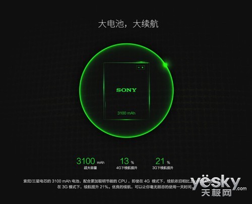 MX4采用索尼/三星电芯的 3100 mAh电池,配合更加聪明节能的 CPU以及系统优化,即使在 4G模式下,续航依旧相比MX3续航提升13%,在 3G 模式下,续航提升21%。