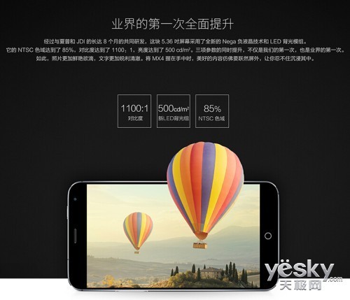 魅族MX4具备5.36英寸超高清屏幕,分辨率为1920*1152,经过夏普和魅族工程师的共同研发,在三项关键参数--亮度、对比度、色域上做到了全面提升。亮度达到了500 cd/m2,对比度达到了 1100 :1,色域达到了 85%。如此全面均衡的提升,让照片更加鲜艳欲滴,文字更加锐利清澈。