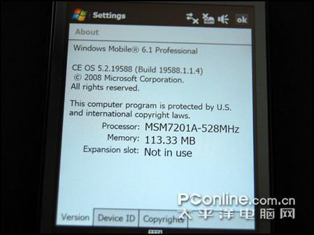 HTC Touch Diamond 手机采用了高通的MSM 7201A平台的CPU,频率达到了528MHz,这颗CPU与高通的MSM 7200系列平台的CPU并没有很大的区别,只是提高了性能的同时并降低了功耗。HTC Touch Diamond采用微软最新版本的Windows Mobile6.1操作系统,当然最具口碑的TouchFLO 3D界面也内置在Diamond里面,这个插件可以让使用者更简便地使用操作PPC手机,新版本的TouchFLO界面非常华丽,具有三种显示模式,TouchFLO 3D界面(天气预报,界面转换等)反应还是相当快捷的。