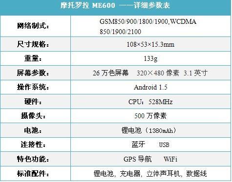 性能方面,摩托罗拉ME600采用的是Android 1.5智能系统,搭配主频为528MHz的高通MSM 7201A处理器,并拥有512MB ROM和256MB RAM。这样的配置保证了程序运行的流畅性。其它方面,摩托罗拉ME600支持GPS导航,WiFi无线上网。此外,该机还支持3.5mm耳机接口、蓝牙2.0以及MicroSD存储卡扩展等功能。