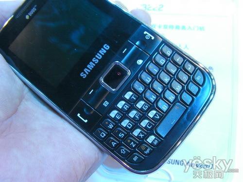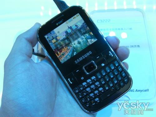 [北京行情] 三星GT-C3222(参数 论坛 软件)并非是智能产品,不过其配备了开心网、QQ等产用功能,可玩性并不弱,这款产品还是一款双卡双待的手机,它采用全键盘设计,比较适合商务人士。目前C3222的行货在商家极客数码的报价为850元,价格比较便宜。 三星C3222的三围尺寸109.5 x 60 x 12.3 mm,重约 95g,配备了一块2.2英寸QCIF 26万色TFT显示屏,显示的分辨率为220x176,全键盘设计比较合理,按键较宽大,导航键采用了流行的光线触摸版,在其两侧拥有一些常用的功能键。