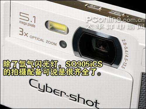 3倍光学变焦、510万像素、对焦辅助灯,以索尼爱立信SO905iCS的配置来应付一般日常拍摄可算是绰绰有余。不过SO905iCS反潮流而行,没有氙气闪光灯,转而使用高亮度LED作为补光设备。关于LED补光的效果,请留意实拍样张分析。