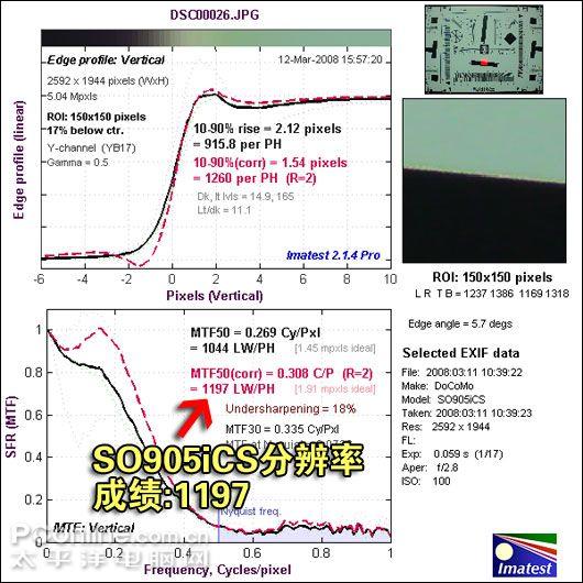 PConline评测室同样采用Imatest软件测试SO905iCS的分辨率。实际测试中得出SO905iCS的分辨率成绩为1197 LW/PH。让我们分析一下SO905iCS处于一个什么样的水平:高级数码单反相机,配合优秀镜头时分辨率可超过2000 LW/PH;一般家庭数码相机在最佳状态下可获得1500 LW/PH的成绩;卡片式数码相机大约是1300 LW/PH左右的水平。SO905iCS的1197 LW/PH成绩相对于数码相机来说,存在较明显的差距。分析其原因,差距主要存在于SO905iCS的感光元件面积很小,造成整体分辨率较低。