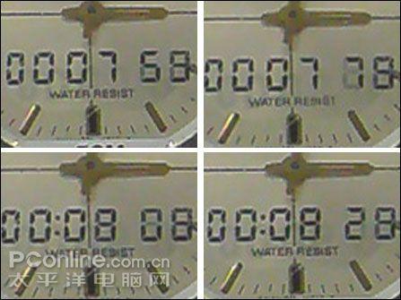 索尼爱立信SO905iCS标榜连拍速度达到7.5张/秒的水平,就是连拍中前一张与后一张拍摄的间隔不会超过0.14秒。实际使用连拍功能时,SO905iCS只能提供640×480分辨率,而且不能调节,每次连拍只能连续拍摄4张。这样的限制所造成的缺点其实相当明显,不得不说SO905iCS的连拍功能其实比较鸡肋。从上图的4张连拍的时间来看,四张时间分别为7秒59、7秒79、8秒08、8秒29,四张间隔时间分别是0.2秒、0.29秒、0.21秒,与理论上的7.5张/秒的时间有较明显的差距。
