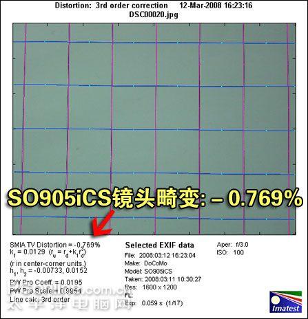 PConline评测室采用专业软件Imatest测试索尼爱立信SO905iCS镜头畸变程度。镜头畸变即镜头由于光学设计或者其他原因,使画面产生变形。测试数值呈负数,表明画面向四周膨胀,为桶形畸变;数值呈正数,表明画面向中心收缩,为枕型畸变。一般数值在-1到+1之间,畸变程度都属于不明显范围。