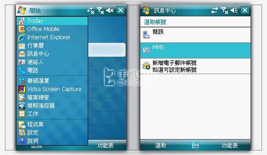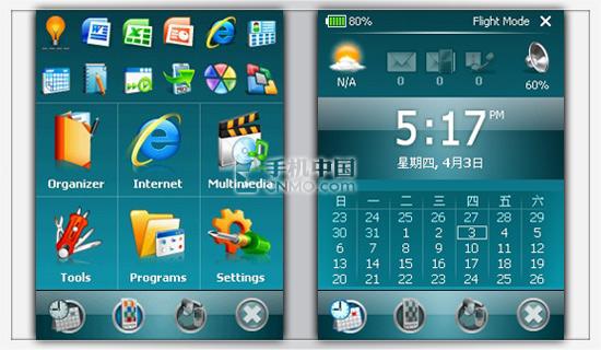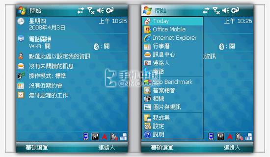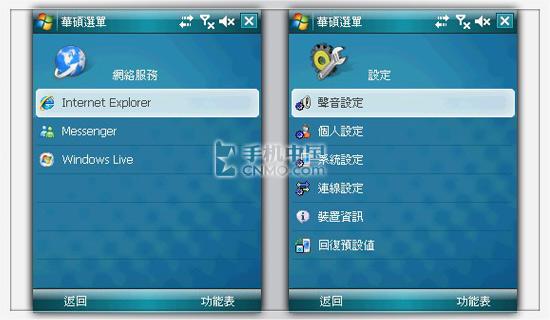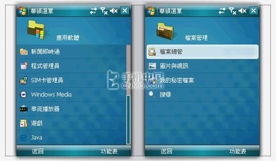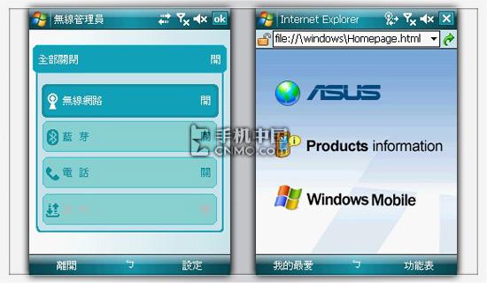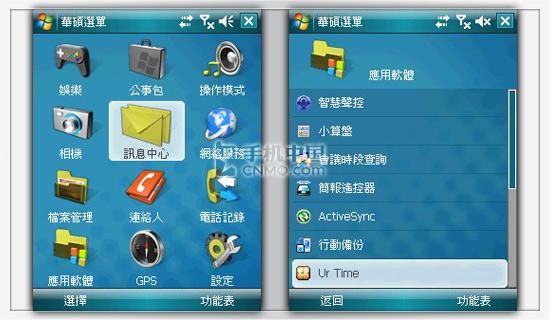 华硕P550采用了标准的Windows Mobile界面风格,不过在其中内置了一个名叫“华硕选单”的主菜单界面插件,采用12宫格设计,其中囊括了手机集成的绝大部分功能,包括娱乐、公文包、操作模式、相机、短信、网络、联系人、GPS、设定等等。