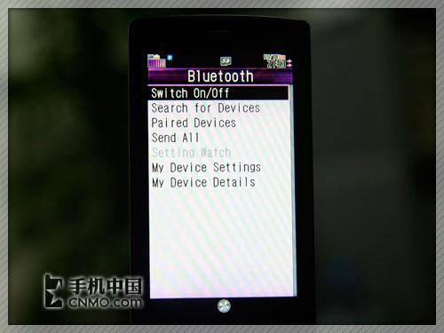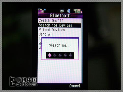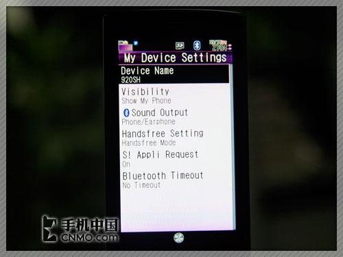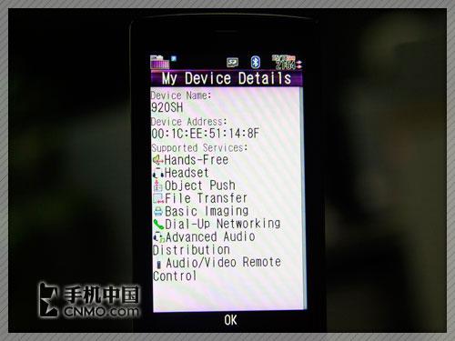 夏普920SH手机也内置了蓝牙功能,与很多日系手机一样,920SH每次与新手机连接前都需要进行配对操作,比较麻烦。笔者测试时利用笔记本自带的2.0版蓝牙适配器,往920SH中传送了一首大小为5.36MB的MP3歌曲,实际传送时间为25秒。另外,902SH手机还支持A2DP功能,用户可以利用蓝牙立体声耳机听音乐。