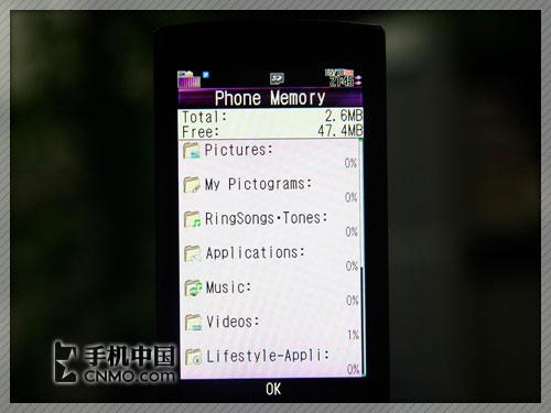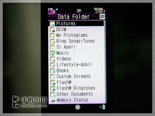 夏普920SH手机的文件管理器分类非常详细,包括:图片、照片、我的项目、铃声、JAVA软件、音乐、视频、生活常用软件、电子书、主题、Flash、Flash铃声、其他和存储器容量查询等。需要说明的是,用户必须把相应的文件拷入对应的文件夹中才能够被手机有效的识别,不然是发现不了的。