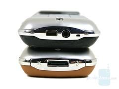 从整体上观察完这两部极度相似的手机,我们再从细小的地方进行对比。从两款手机的侧面对比来看,厚度几乎相当,只是长度上有明显差别。另外手机底部的对比差别明显,V9采用MiniUSB数据接口和2.5毫米标准耳机插孔,而Vertu星座则采用了特殊的数据接口,耳机接口并未提供。