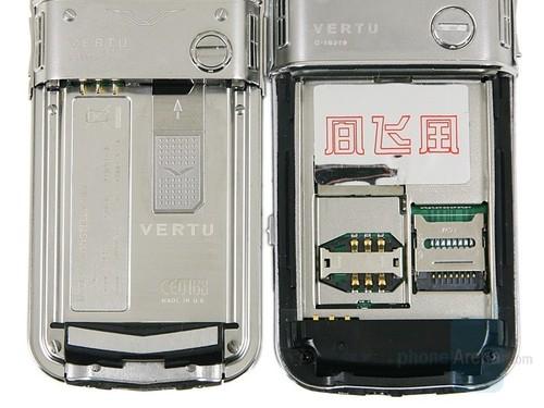 两款手机的背面也是如出一辙的相似,一眼看去基本上只有颜色和体积的差别了。打开电池盖,能够发现Vertu的内部构造更为精密一些,而V9内部贴有三个奇怪文字的标识,或许是这一品牌的防伪标志吧。
