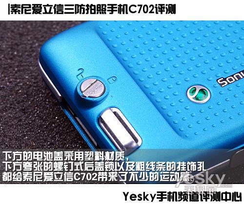 下方的电池盖采用塑料材质,但下方夸张的螺钉式后盖锁以及粗线条的挂饰孔都给索尼爱立信C702带来了不少的运动感。