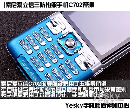 屏幕下方的则为键盘区,索尼爱立信C702的导航键并没有采用摇杆导航键而是采用了五维导航键。左右软键与传统的索尼爱立信手机的键盘布局没有差别。该机的数字键盘采用了水晶键设计,但窄小的按键面积,生涩的手感影响了用户的按键体验,也许是处于三防的密封性考虑,这点倒是可以理解。