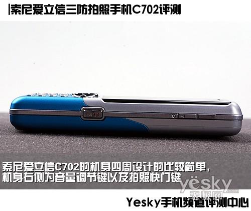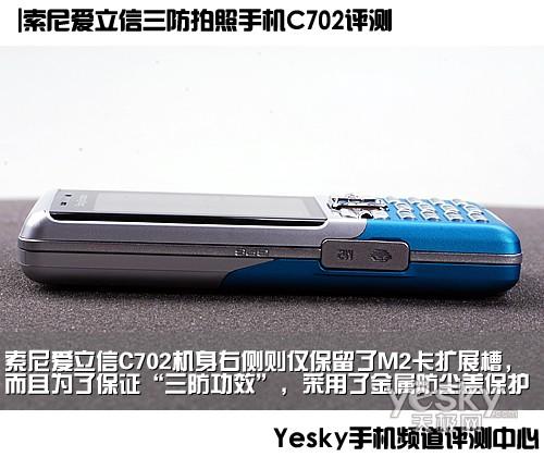 索尼爱立信C702的机身四周设计的比较简单,机身右侧为音量调节键以及拍照快门键,机身右侧则仅仅保留了M2内存卡扩展槽,而且为了保证“三防功效”,采用了金属防尘盖保护。但机身底部的三合一接口却裸露在外,不知道在遇到水溅时会不会出现问题。