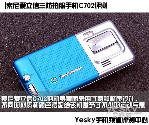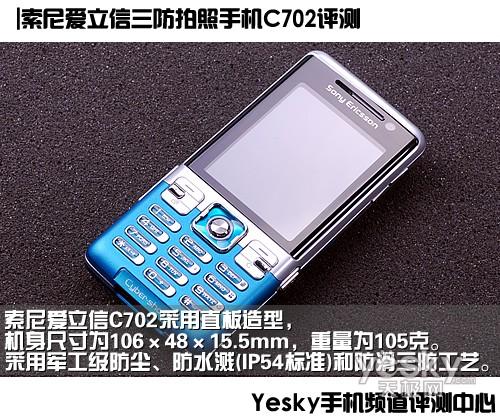 索尼爱立信C702采用直板造型,机身尺寸为106×48×15.5mm,重量为105克。该机采用军工级别防尘、防水溅(IP54标准)和防滑的三防工艺。机身做工精良,密封性良好。