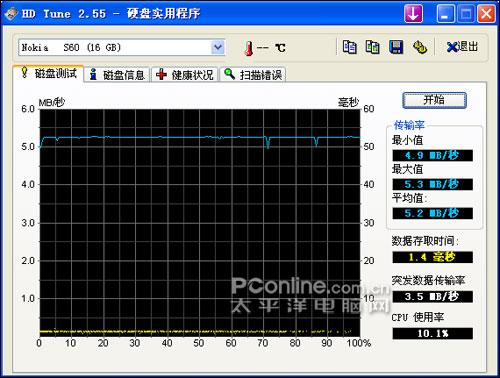 由于三星i8510内置的是大容量闪存,我们也对此做了传输速度测试,采用的是应用比较多的HD Tune测速软件。从测试的结果来看,三星i8510的平均传输速度为5.2M/秒,算是一个比较好的成绩,而且传输的稳定性也比较好。