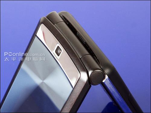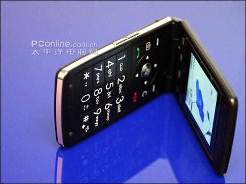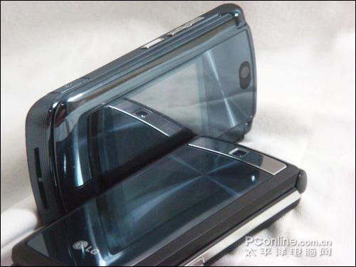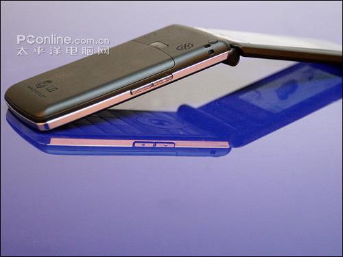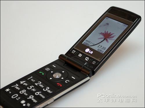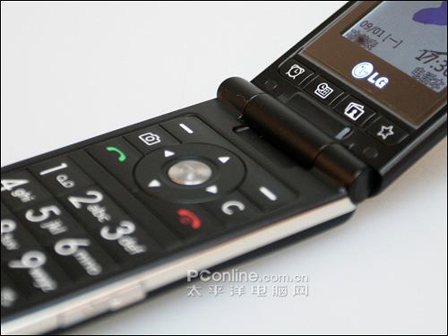 LG KF300e的上下翻盖并不是“齐”的,上翻盖稍微短一点,所以看起来感觉很舒服,时尚感强了。打开翻盖,转轴的力度适中,值得一提的是,KF300e的转轴没有丝毫的松动,非常紧凑,和日系手机喜欢松松垮垮不同,韩系的LG还是比较接近中国用户的口味的^_^。