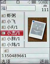 联系人的查找也比较方便,支持首字母查找,KF300e的查找界面比较另类,上方查找的内容,例如我们输入字母X,中间会显示X开头的联系人名字以及照片,下方则是号码,整个界面一目了然,值得称赞!