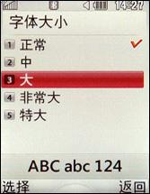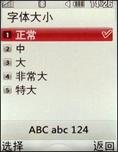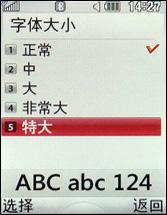 LG KF300e号称适合任何年龄层的用户使用,随着手机的普及,现在就算小朋友都可能会操作手机、发发短信,但老年用户主要的问题在于视力的原因看不清屏幕的内容,所以KF300e配备了多级别的字体大小调节,总共有5级:正常、中、大、非常大、特大。其中我们正常使用的话,“正常”已经够用了,在设置界面的下方,有字体大小的样式给我们对比,菜单设置还是比较人性化的。