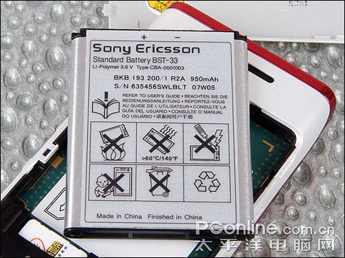索爱W595使用的是在索尼爱立信手机中非常通用的BST-33,950毫安时的电池,在光线感应器的辅助之下,经过普通程度的使用,W595大概可以使用3天的时间,表现非常不错。
