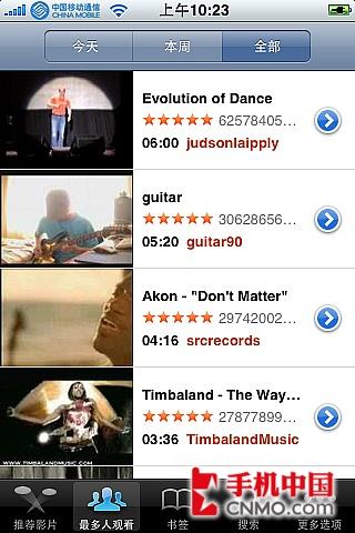 从iPhone 3G手机内置的YouTube软件功能上来看,其提供了推荐影片、最多人观看等人气最高的YouTube视频推荐,方便用户进行收看。同时还提供了书签的功能,方便用户下次快速的查找观看,并且还提供了搜索的功能让用户进行搜索。