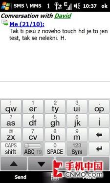HTC Touch HD内置了Phone Keypad、Compact QWERTY、Full QWERTY、手写、Block Recognisers等等输入法。所有这些输入法当然都可以输入,可惜没那么好用,主要问题是按下按键后的放大效果还是被手指挡住了,所以无法确定自己按对了没。另一个问题是,输入自动纠错功能很弱,不是很智能。