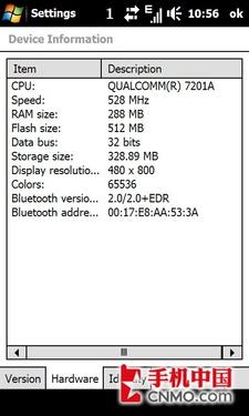 HTC Touch HD的硬件配置在WM手机中绝对可以算的上是顶级!搭载Windows Mobile6.1操作系统,配备一颗528MHz主频的Qualcomm MSM7201A处理器,机身内置288MB RAM和512MB ROM的内存容量。