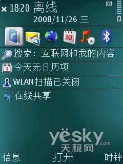 诺基亚采用了全新的Symbian 9.3智能操作系统以及S60 V3.2 FP2人机操作界面,在待机状态下,与以往的S60系统没有本质差别,但在菜单过度上则增加了一些绚丽的效果。宫格式经典菜单也是S60一成不变的经典设计,良好的菜单逻辑也是诺基亚科技以人为本的最好体现。