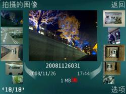 内置的拍照软件也与传统的S60拍照软件相似,可选用户自定义、微距、肖像、夜景、夜间肖像、运动及风景等拍摄模式,可选10秒、30秒、1分钟、5分钟、10分钟等定时拍摄模式,支持白平衡、感光度、曝光、亮度、清晰度、色调、对比度调节。