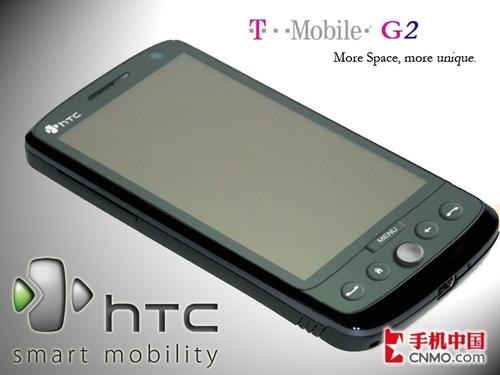 T-Mobile G2整体外形与G1基本一致,还是侧向滑盖的全键盘。不过那个翘起的尾部被拉直了,屏幕可以向上掀起一定角度,按键排布并无变化,轨迹球改为碗状按钮而非球形滚珠。从标识可以看到,G2仍将由HTC代工。