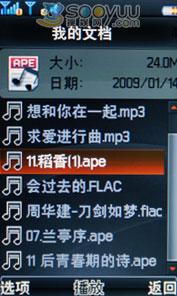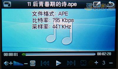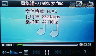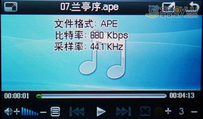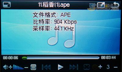 下面我们重点来看看该机支持的APE和FLAC格式文件,一般MP3的码率是128~192KBps,大部分的高音、低音都被压缩掉了。而APE、FLAC一般为1MBps,是普通MP3的5~8倍,与CD原音相比毫无压缩。对于电脑来说,播放这两种格式的文件可能不算什么了,可对于手机MP4这样的数码产品来说就需要比较好的硬件配置才能够达到播放要求。