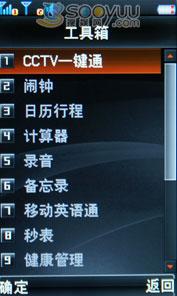 此外,该机还支持FM收音机功能,需要插入耳机才能收听,支持自编铃声,在工具栏里,还有很多实用软件,如闹钟、日历行程、计算器、录音、备忘录、移动英语通、秒表、健康管理、CCTV一键通、单位换算、货币换算、世界时间等。