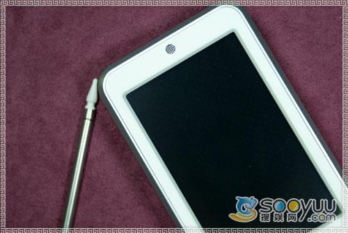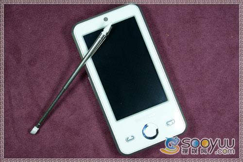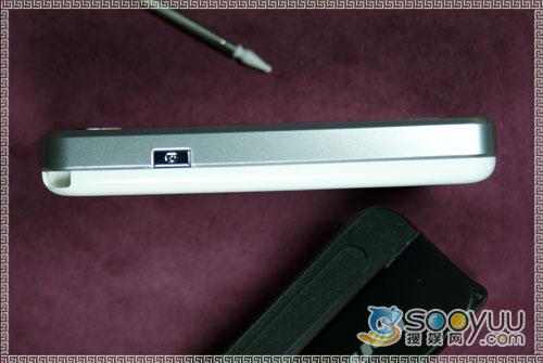 手机的顶部顶部没有任何附加设计,顶部左侧是该机的非标准USB接口,USB接口右侧是话筒部分,靠后盖的部位有一个锁扣,轻轻按下去即可取下电池后盖来。另外还有一个手写笔插槽。