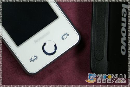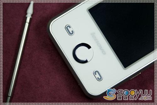 联想i60采用了全触屏操作,因此取消了数字键的设置,只在手机的屏幕下方设置了三个按键,左右两边分别是手机的拨号和挂机键,中间的按键貌似方向键,但却不是,这是该机的确定键,而且该键还设计得很有趣,圆圈只有3/4采用了金属包围,看上去比较另类。屏幕上方是该机的听筒,采用的是网状结构。