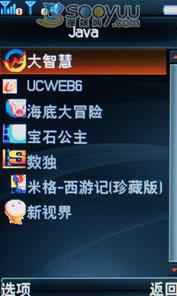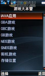 在JAVA文件里,还有大智慧、移动QQ、海底大冒险、宝石公主、UC-WEB 6.0、数独、西游记等JAVA软件和游戏。内置麻将连连看、魔法寿司和对战麻将几款传统游戏。此外,该机还内置了游戏模拟器,可以支持部分街机,32位GBA,FC,SFC,GB,GBC的游戏,该项需选配I/O口手柄,还需要自行下载游戏文件。