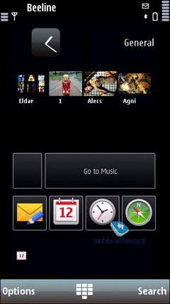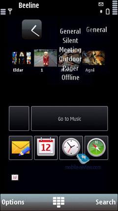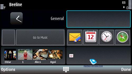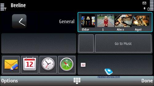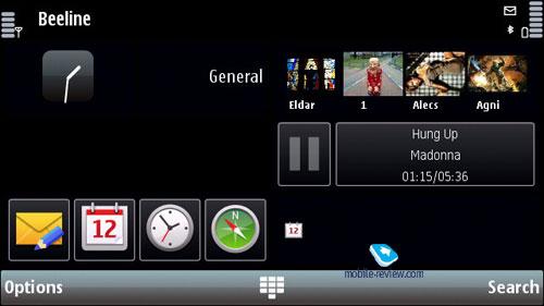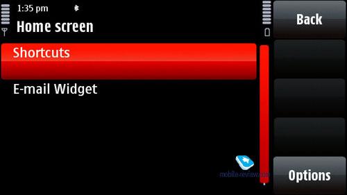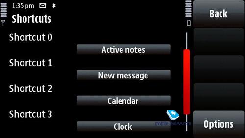 由于N97的屏幕够大,因此在待机画面我们看到可以设置更多的个性化快捷方式或者软件快速启动,如天气预报、邮件通知等等。