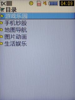 在之前笔者使用的电信天翼3G手机中,手机下载服务下面的内容还是空的,现在三星M609显示,其中内容已经开始有了,我们可以看到点击程序下载可以列出分类,包含了游戏乐园、手机炒股、地图导航、图片动画、生活搜索几类。