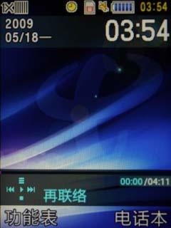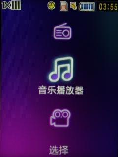 向下滑盖打开,界面也随之变换为音乐多媒体界面,可选视频播放、音乐播放、FM收音机三种媒体形式。