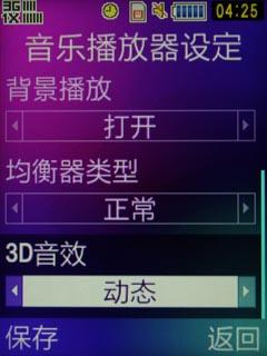 三星M609内置的音乐播放器可以在下面的界面启动,首次启动时,手机会装载音乐,也就是搜索机内音乐并列表呈现。该播放器可以依据艺术家、流派、专辑等多种方式筛选歌曲,可以自定义均衡器;自建播放列表、背景播放等功能也一应俱全,同时支持3D音效设置,功能可谓全面。