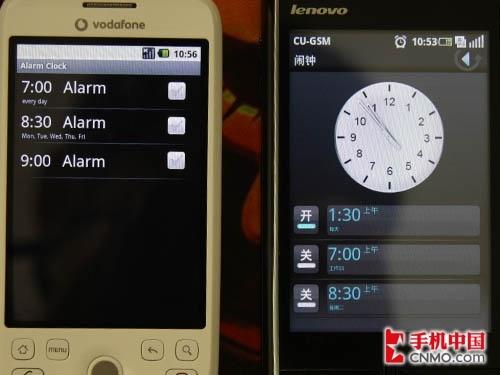 这是两者闹钟界面的样子,联想Ophone在该界面还有一个指针式的中表显示,显然比HTC G2 Magic更加美观。