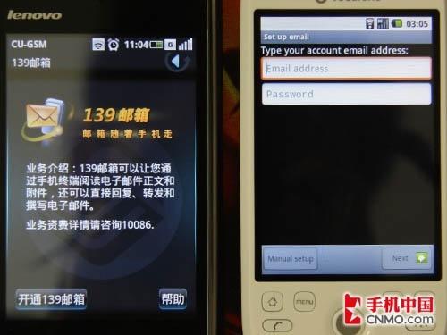不考虑HTC和联想这两家手机厂商,仅从中国移动和Google来看,邮箱和其他一些工具区别在Ophone和G2上体现得比较明显,在Ophone中,大部分服务基于中国移动,比如邮箱,就有专门的139邮箱客户端,而G2的邮箱则默认为Google帐号。但是,二者对其他服务商的邮箱也能很好地支持,不过需要在详细设置里针对不同类型的账号分别设置。