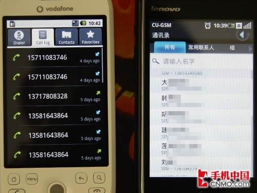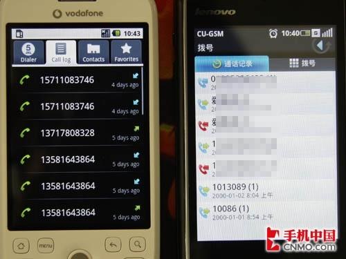 通迅功能无非是拨号、通话记录、联系人不过二者还是有一定差别,HTC G2 Magic将四项内容以标签列表的形式全部放在一个界面,而联想Ophone的处理方式是拨号盘和通话记录在一起,联系人和常用联系人在一起。