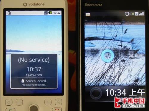解锁方式也存在一些差异,由于HTC G2 Magic有更多按键,因此解锁借助菜单键,而联想Ophone则是利用屏幕触控的方式进行解锁,将圆环拖动至对应的地方即可。